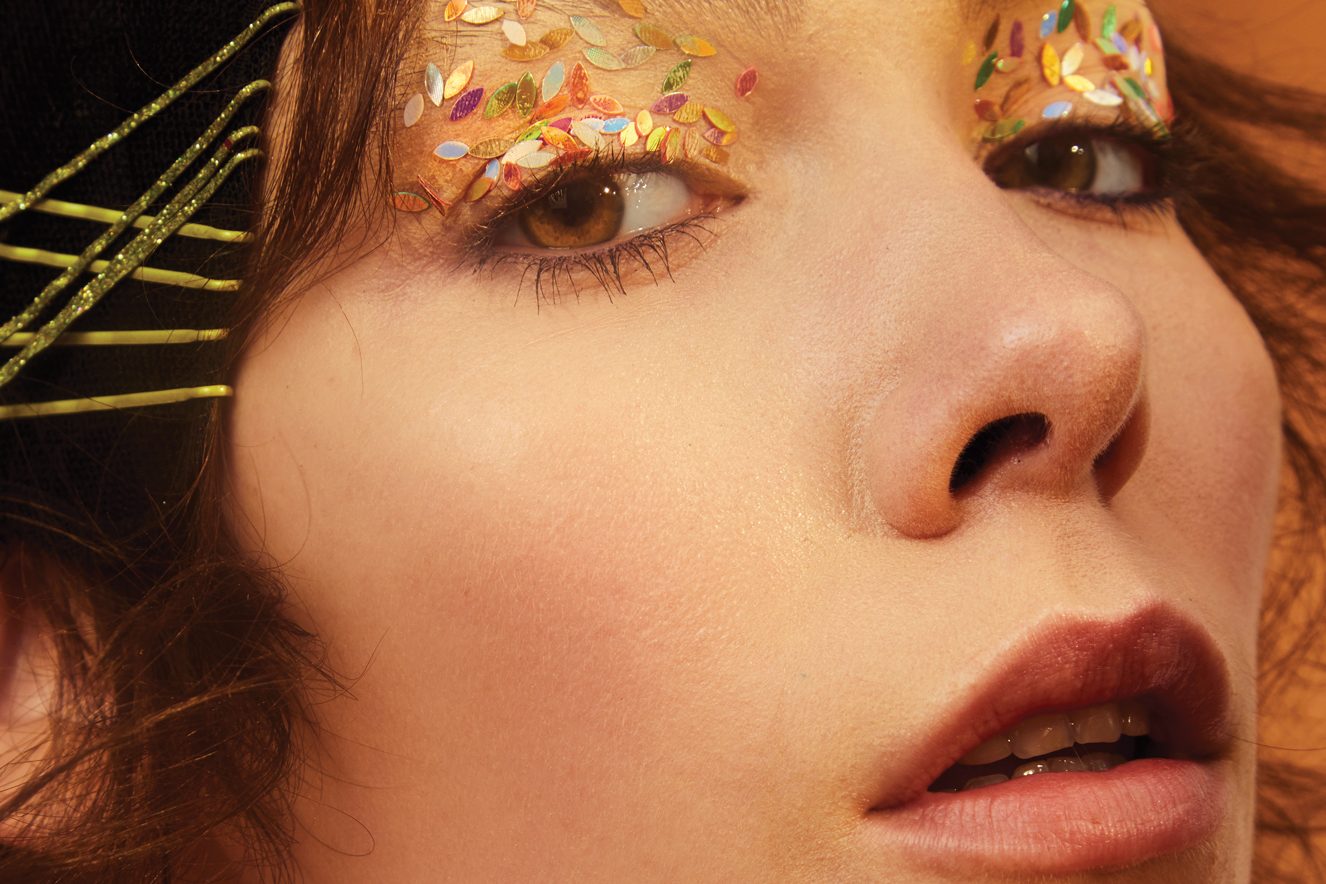 São os micropaetês em formato de folhas que, aplicados um a um sobre toda a pálpebra, dão efeito artsy a este visual. A sobrancelha neutralizada com corretivo sobre os fios é a finalização ideal para dar mais destaque ao brilho dos olhos.