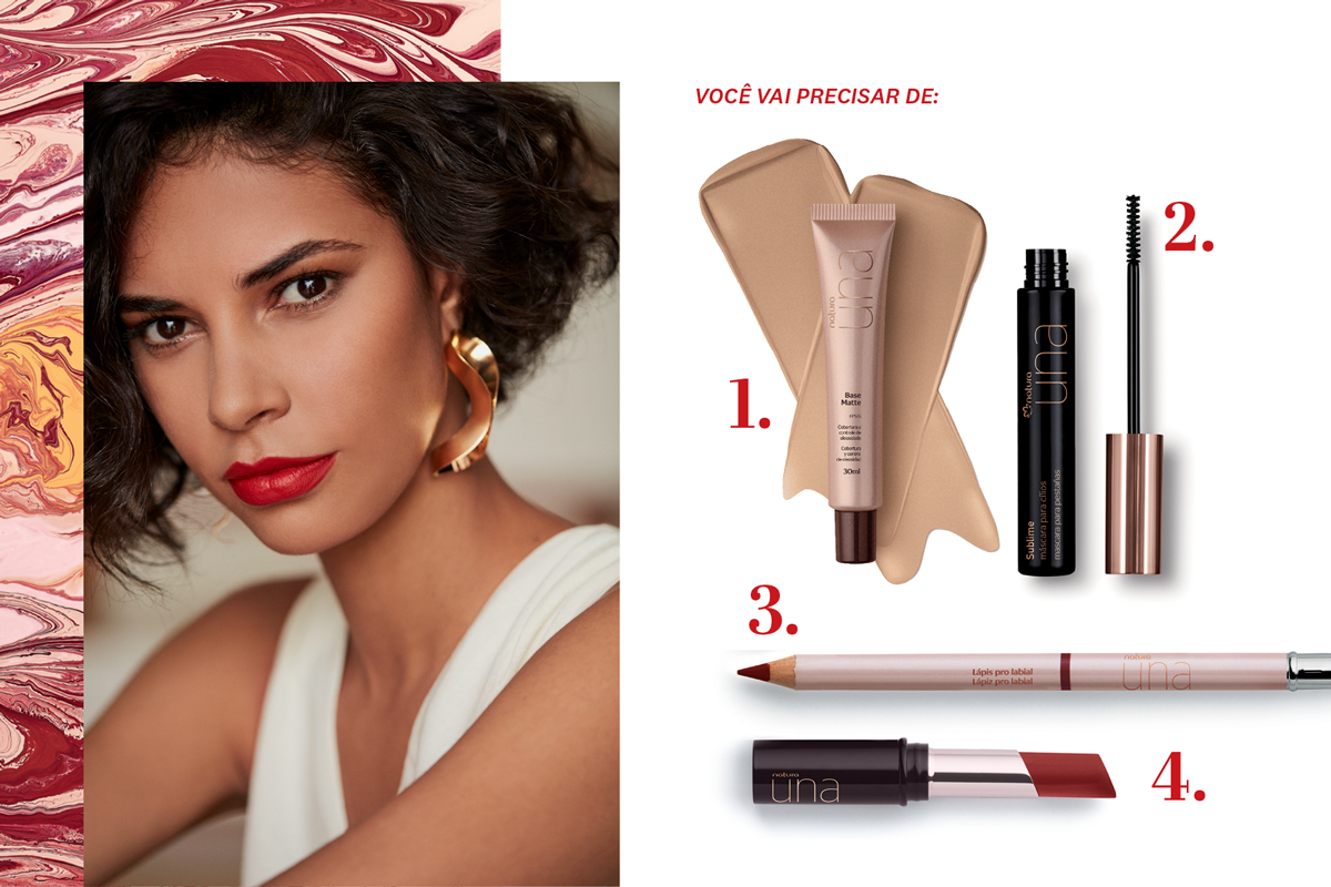 3. A cereja no bolo fica por conta do bocão marcado e bem delineado. Primeiro defina o formato dos lábios com o Lápis Lábios UNA Rouge e finalize com o Batom Matte longa duração UNA Rouge 2M. O look vai durar a noite toda!