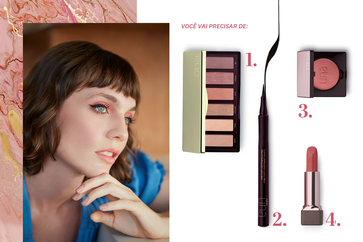 1. Look monocromático está em alta! Para surfar nessa onda, a dica é misturar os diferentes tons da Palette de sombras 6 tons UNA Rose, aplicando um leve esfumado rosado no côncavo para dar profundidade ao olhar.