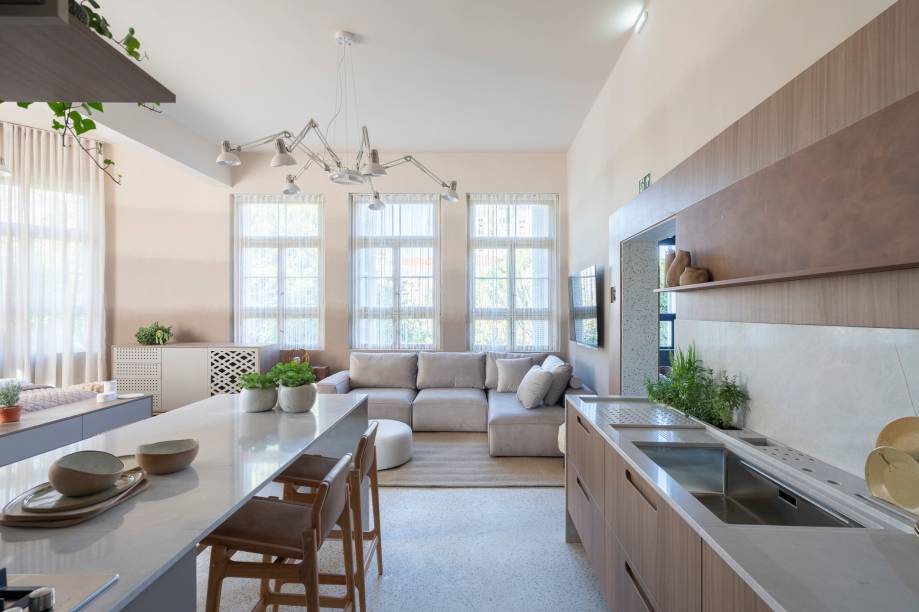 Integrar a sala com a cozinha é uma expressão das tendências do homestyle bem atual pois prioriza o convívio entre as pessoas e o compartilhamento de experiências.
