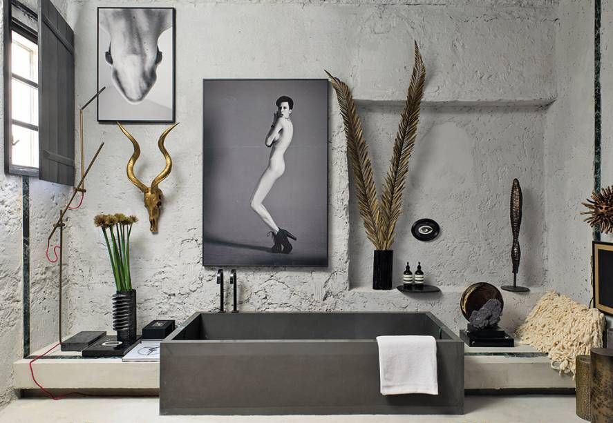 O cimento queimado com uma textura mais rústica combina com o clima moderno e nada ortodoxo que o profissional queria. O contraste dos tons cinza é marcante, seja pelos quadros do fotógrafo brasileiro Ivan Erick, na cuba da pia e nos adornos pretos. É um banheiro cheio de personalidade!
