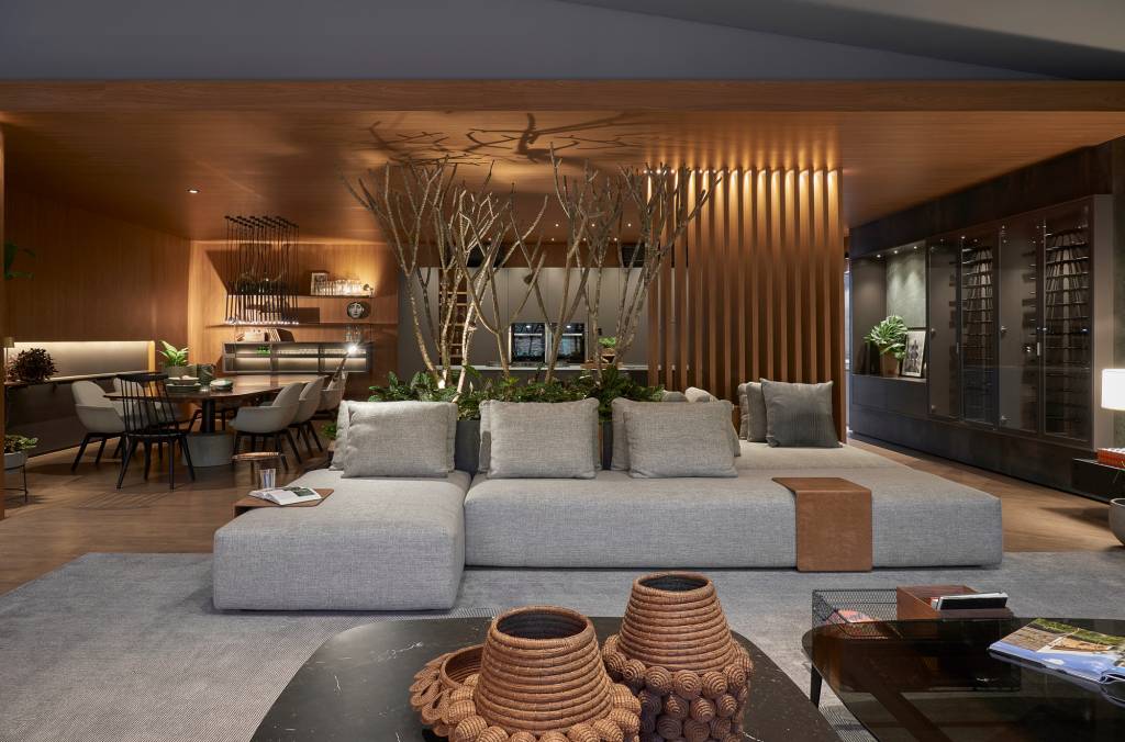 Com tantas pressões externas, o lar deve ser um refúgio para a alma. É o que defendem os irmãos Bittar. Com isso em mente, a dupla de arquitetos projetou o espaço Respiro, que explora formas fluidas e muita madeira nas paredes. Para dar contrapeso e proporção, os móveis apresentam partes de metal ou concreto, mas com estruturas vazadas, o que mantém a leveza e permite a livre circulação de ar.