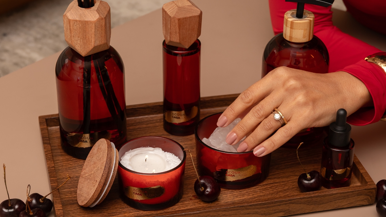 A collab Acqua Aroma + Casa Claudia apresenta a fragrância Velvet Cherry, um equilíbrio entre a suculência da cereja, a suavidade da amêndoa, o frescor cítrico da bergamota e o bouquet floral de rosa e violeta, com fundo amadeirado e ambarado.