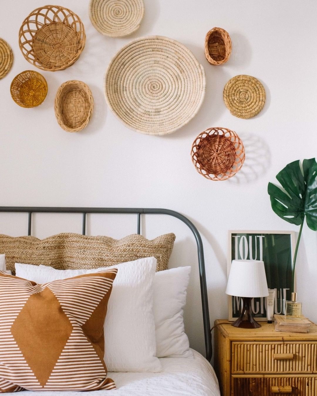 Que tal dar um up na parede da cabeceira do seu quarto? Uma ideia é montar uma composição de cestarias na parte mais alta, como neste ambiente da foto acima. Aqui, cestas de vários tamanhos e formatos compõem o arranjo. Para ficar ainda mais interessante, procure peças de vários tipos de palha para variar as cores.