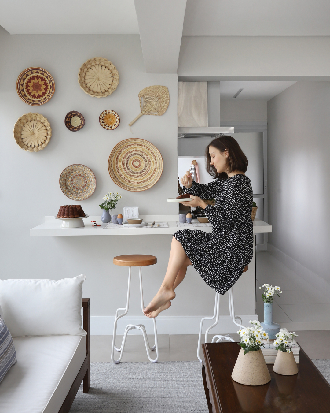 A arquiteta Gabriela Toledo escolheu montar um arranjo de cestarias em um canto da sala deste apartamento para trazer um toque aconchegante ao décor cinza. A base neutra da paleta foi mantida, mas o espaço ganhou ainda mais charme.