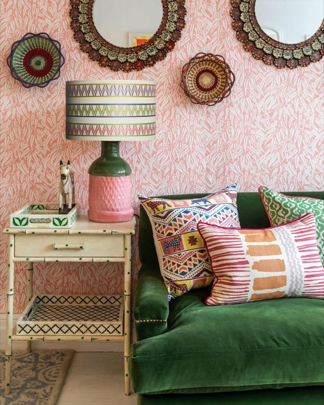 Aqui, uma ideia para quem curte o visual maximalista. Um papel de parede estampado serve de fundo para uma composição de cestarias e espelhos, que complementam com charme o sofá de veludo verde.