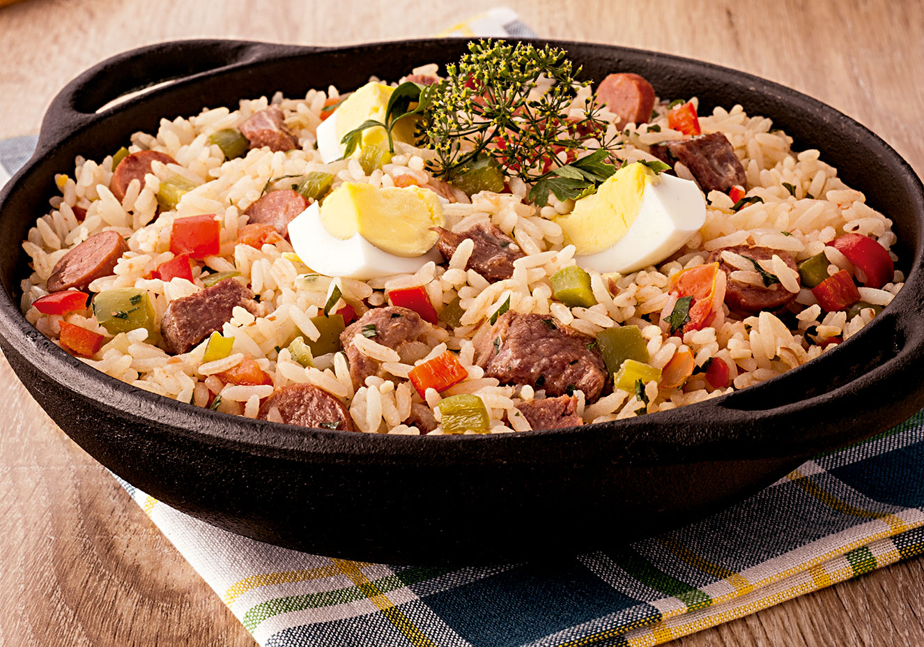 Na panela de pressão, aqueça o óleo e doure a cebola e o alho. Junte a carne e o arroz e refogue por dois minutos, mexendo. Adicione o tomate, o sal e a pimenta. Ponha a água. Misture bem e tampe a panela. Depois que começar a pressão, cozinhe em fogo baixo até o arroz ficar macio (por, aproximadamente, dez minutos). Se for preciso, junte mais água ou cozinhe até secar. Ao sair a pressão, abra a panela e transfira o arroz para uma travessa. Decore com o cheiro-verde e os ovos.