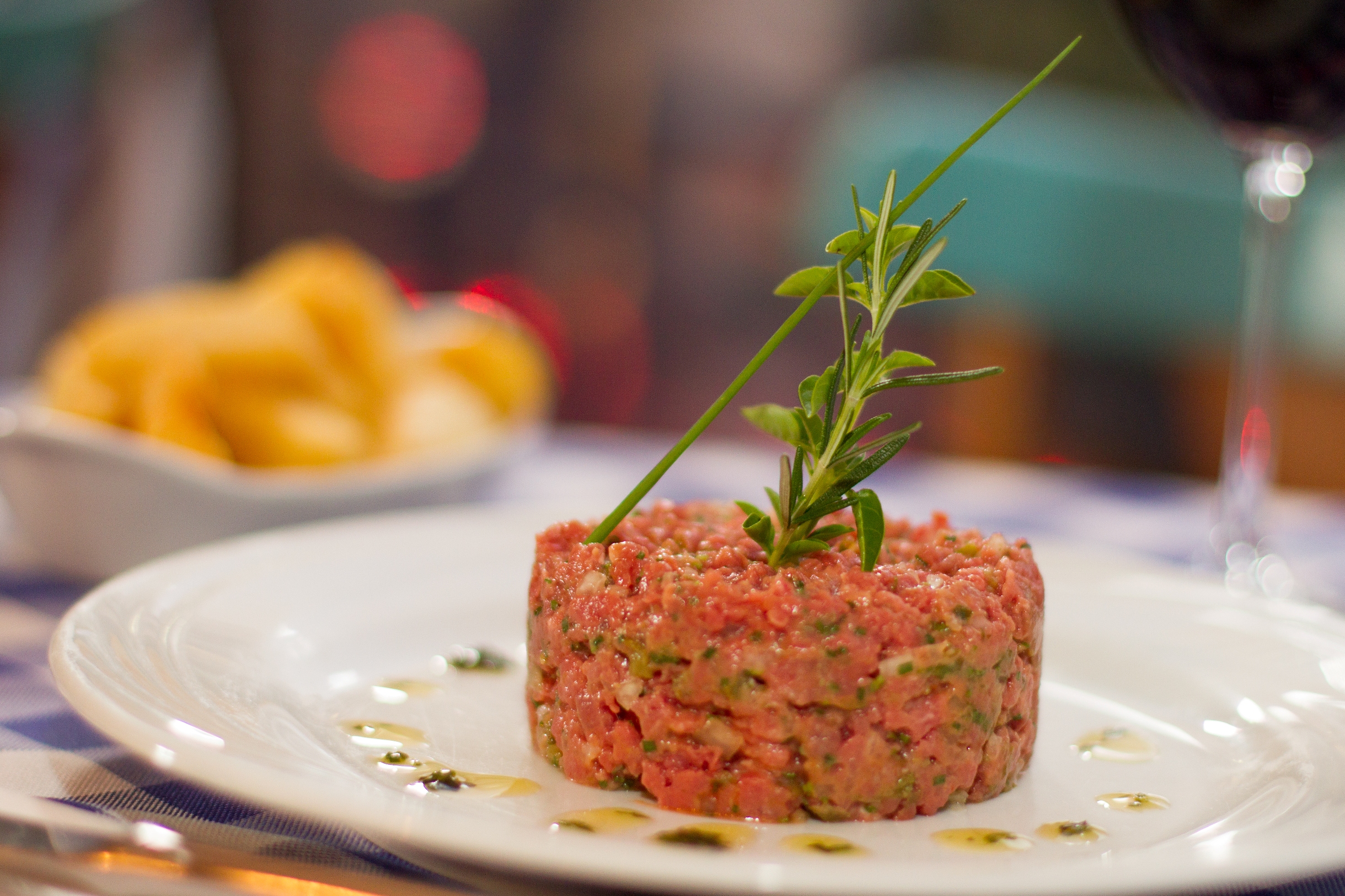 Em uma tigela de inox, coloque gelo e, sobre ele, posicione outra tigela com a carne moída. Com cuidado para não amassar a carne, misture a ela os demais ingredientes. Sirva com batatas fritas e salada verde.