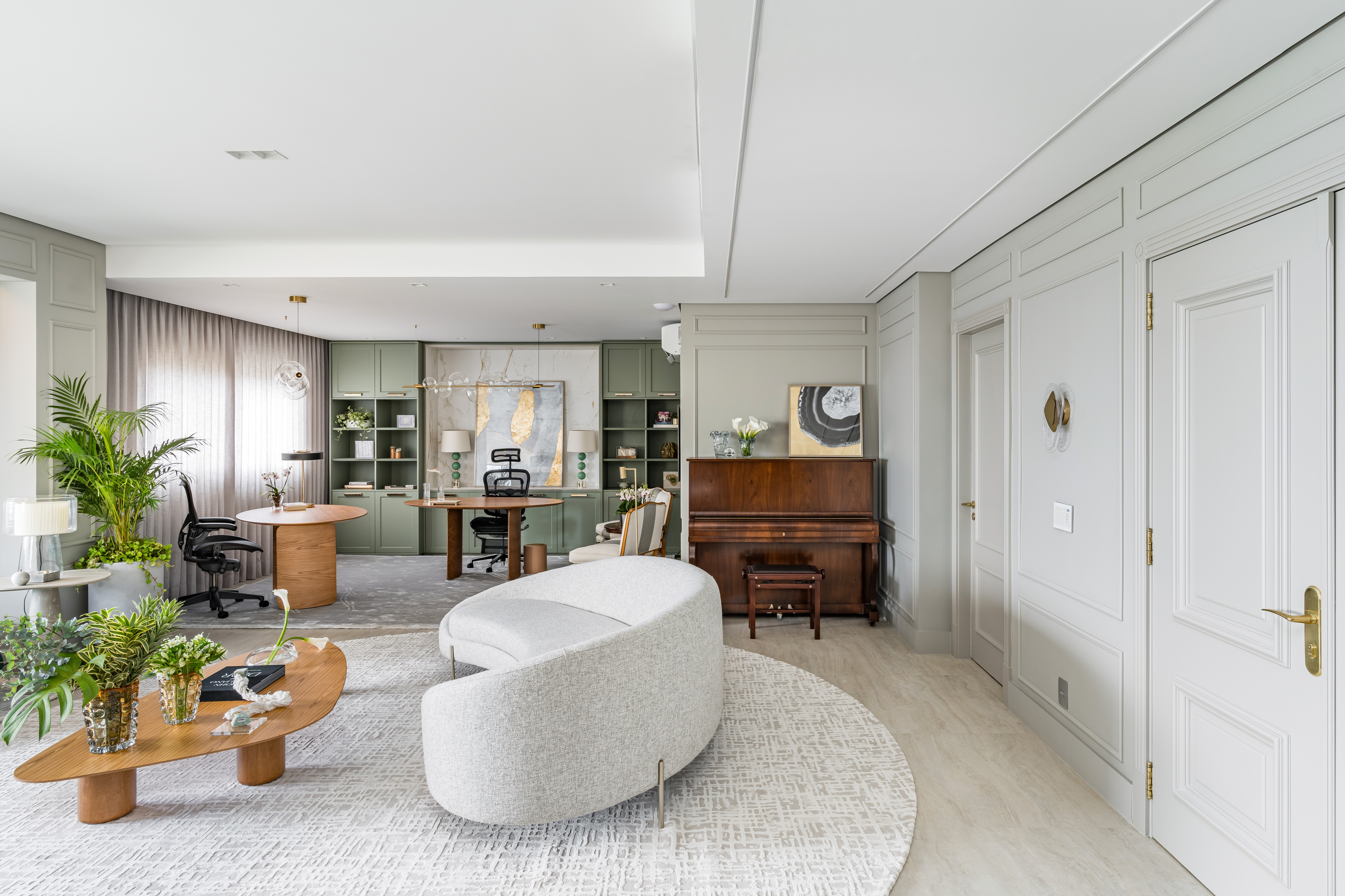 As curvas seguem como uma das linguagens mais fortes do design de interiores. No projeto acima, o tapete eleito pela arquiteta Ana Rozenblit demarca o dentro do living e tem a curvatura do sofá como um complemento. Os itens de destacam dentro da cor Cloud Dancer, eleita pela Pantone para 2026.
