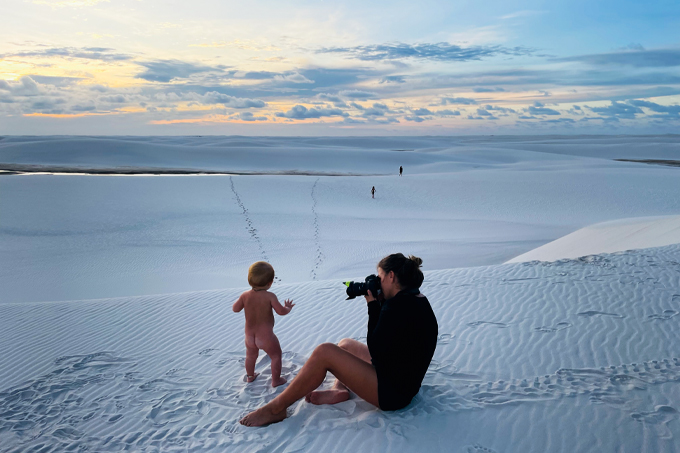 O mar por perto e uma gravidez tranquila, sem grandes enjoos, a permitiram seguir com a prática esportiva. O processo, porém, era solitário, pelo período pandêmico e pela escolha de não postar nada nas redes sociais. Apenas os mais próximos sabiam. “Não senti desejo de compartilhar. Era incrivelmente íntimo. Me irrita essa coisa das pessoas acharem que podem encostar em você, comentar disso ou daquilo que você está fazendo – ou deixando de fazer.” Com Forest na barriga, a fotógrafa só saiu do casulo para trabalhar na Alemanha e na França. “Tinha tempo para mim. Se eu tivesse que ficar num escritório a gravidez inteira, com uma outra condição financeira, seria diferente”, pontua. “Queria ficar longe dos julgamentos. Me senti bem recolhida.”