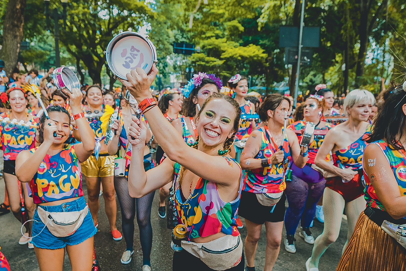 Uma das principais transformações promovidas por elas é a ocupação de espaços antes reservados apenas aos homens, como na dianteira da bateria. Entoando clássicos de vozes femininas da música popular brasileira, o Bloco Pagu coloca 150 mulheres ritmistas para tocar no centro de São Paulo – o nome é uma referência à escritora feminista Patrícia Galvão. Ele foi fundado em 2016 por duas amigas, Mariana Bastos e Thereza Menezes, que perceberam o vácuo de representatividade feminina no Carnaval. Em blocos mais antigos, as mulheres ficam com os instrumentos mais leves, como o chocalho. No Pagu, há 30 delas tocando o mais pesado deles, o surdo. “A procura foi muito alta. Não tínhamos noção clara de que não ter esse espaço era um problema tão grande”, diz Thereza. O grupo rapidamente se ampliou, pois as mulheres encontraram no bloco não apenas samba mas também acolhimento – inclusive em casos de violência doméstica. “Queríamos que fosse um lugar em que elas se sentissem bem”, afirma Mariana.