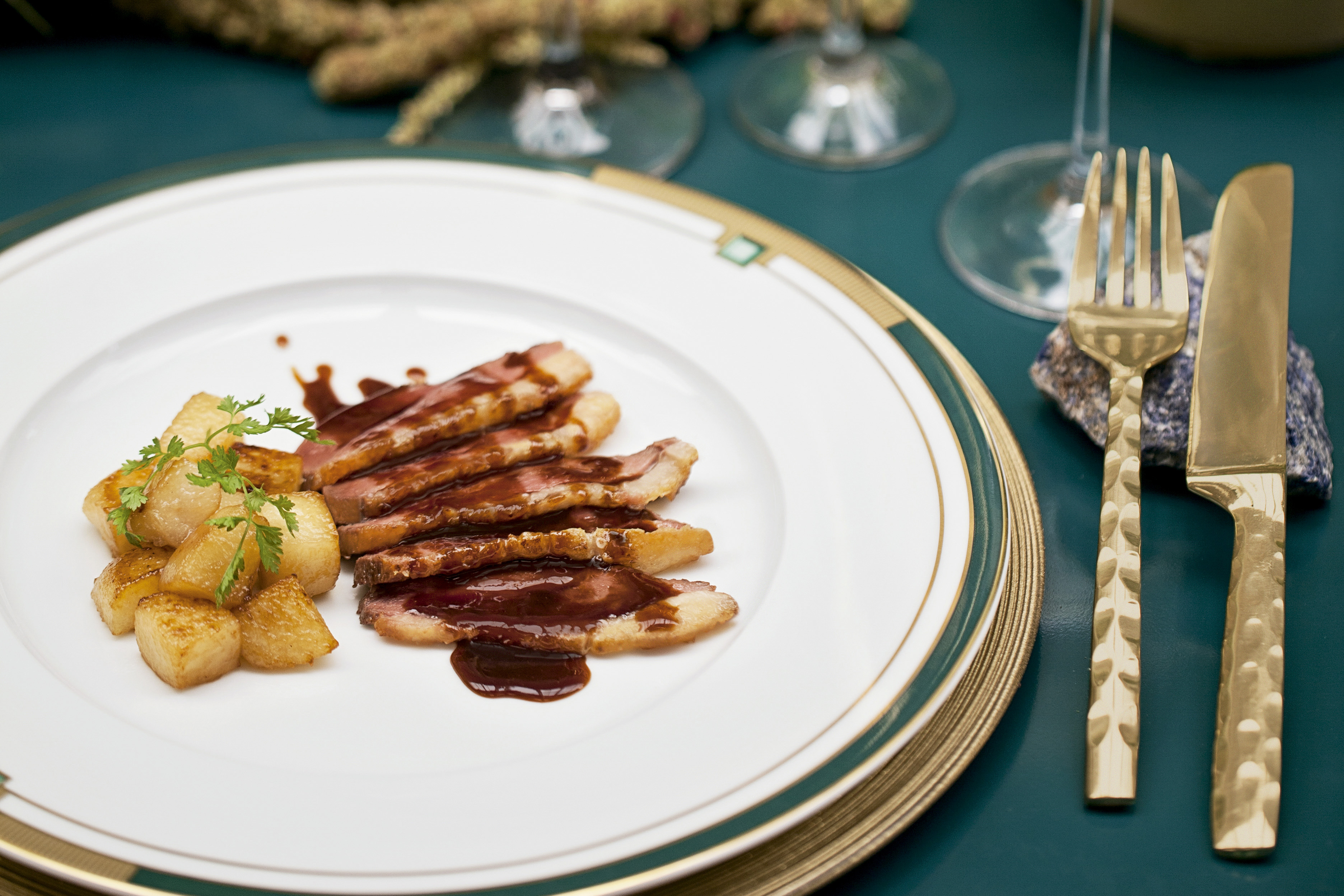 Aposte em pedras brutas ou com pouca lapidação para modernizar a mesa – aqui, elas foram usadas como descanso de talher. Combine a cor prevalecente com o tom da produção para deixar o conjunto harmonioso.