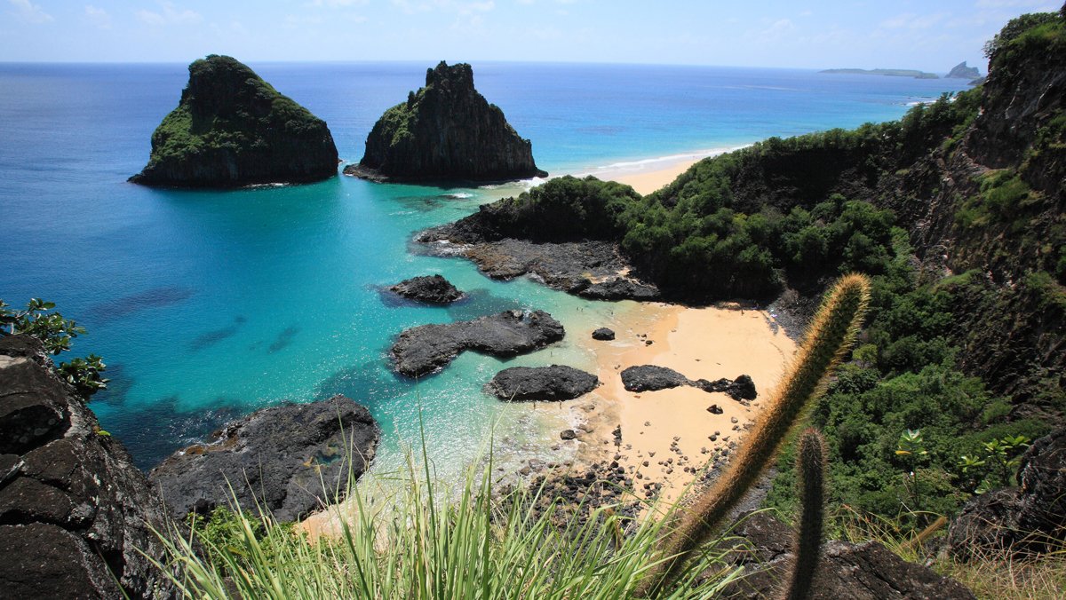 O exclusivíssimo arquipélago de Fernando de Noronha é de um azul de enlouquecer e funciona como convite permanente para uma vida mais tranquila (mas não sem glamour). É um lugar incrível para andar por aí, se esticar na areia e, ainda, ver e ser visto. Um look praiano esportivo combina com esse destino. Fecha a produção o modelo de óculos com acabamento branco acetinado e lentes azuis em degradê