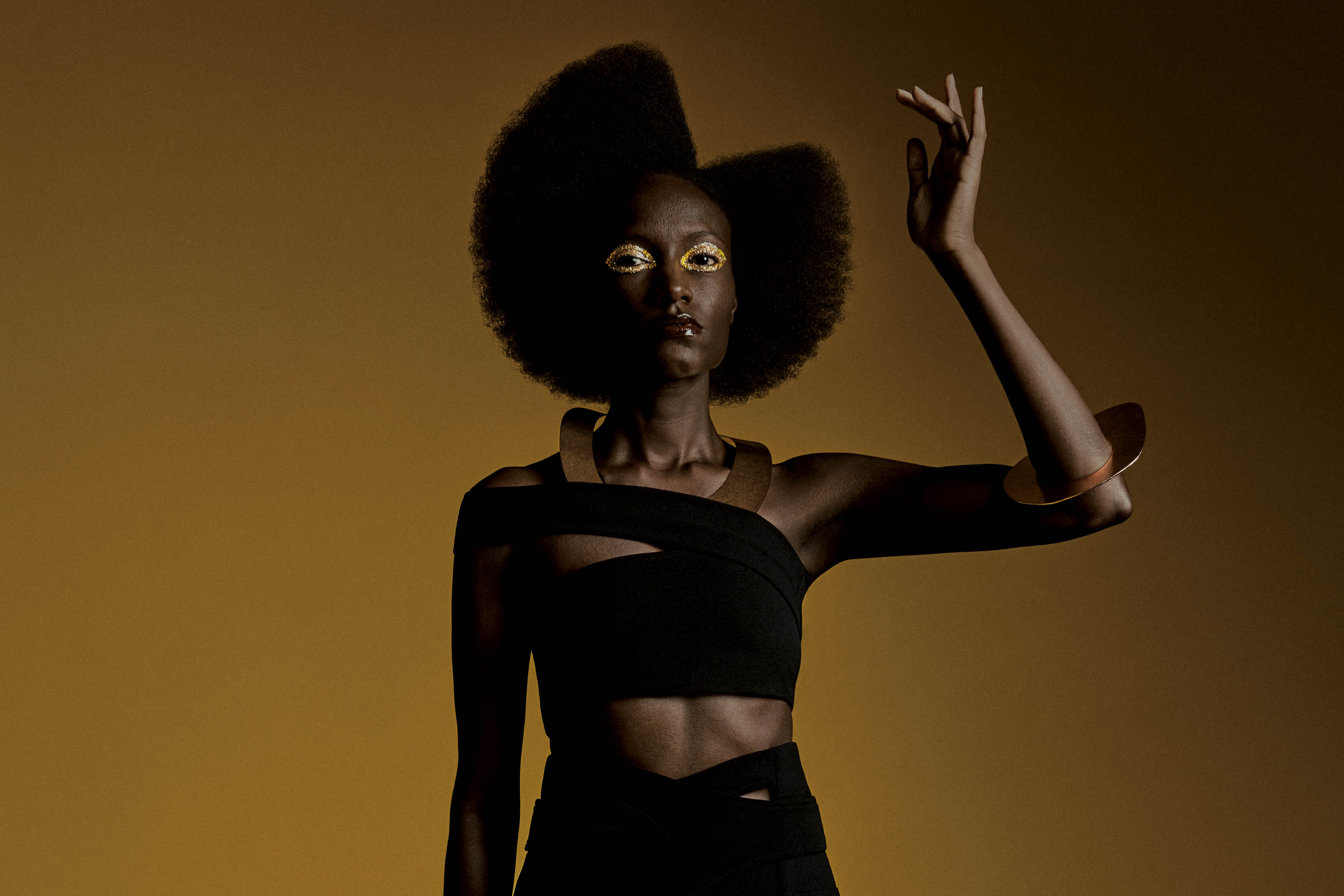 Maiô, Woma; mangas, Rober Dognani; brincos, Lazara Design (Thais Vandanezi/CLAUDIA) A sobreposição não é um artifício reservado apenas à moda. Aqui, ela aparece em um olho com variadas texturas de pigmentos metalizados, glitter e aplicações para garantir o efeito dramático. Brincos, Nadia Gimenez (Thais Vandanezi/CLAUDIA)