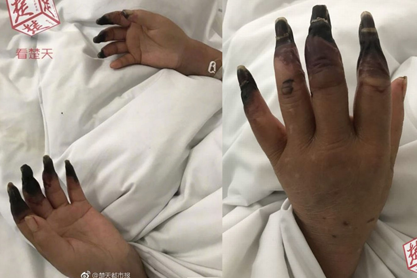 Passados dois dias do acidente doméstico, a mulher notou um pequeno hematoma no local. A mancha se espalhou por toda a mão da chinesa e, com exceção de seu polegar, seus dedos ficaram pretos. Ao todo, oito dos dez dedos ficaram escuros, a princípio, por conta do corte.