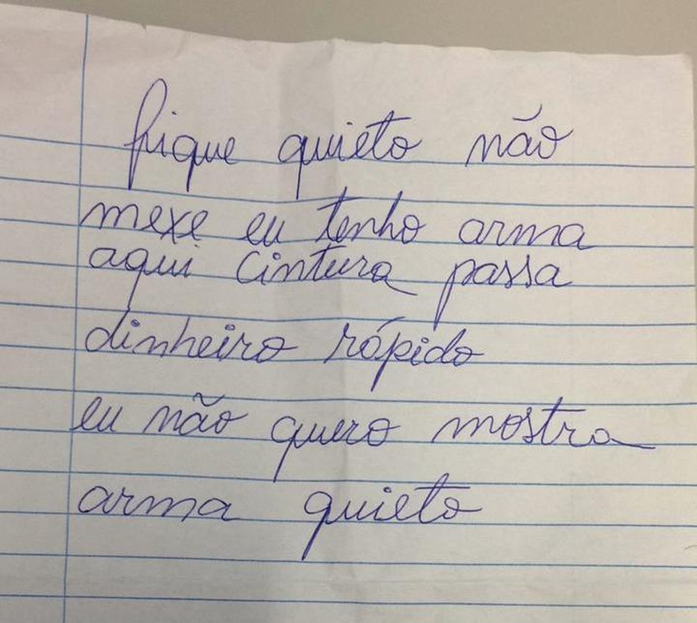 No pedaço de papel, ele informa que está armado e pede para as pessoas não se mexerem. No boletim de ocorrência, os funcionários informaram que o assaltante não disse nada e que gesticulava para avisar sobre a arma de fogo.