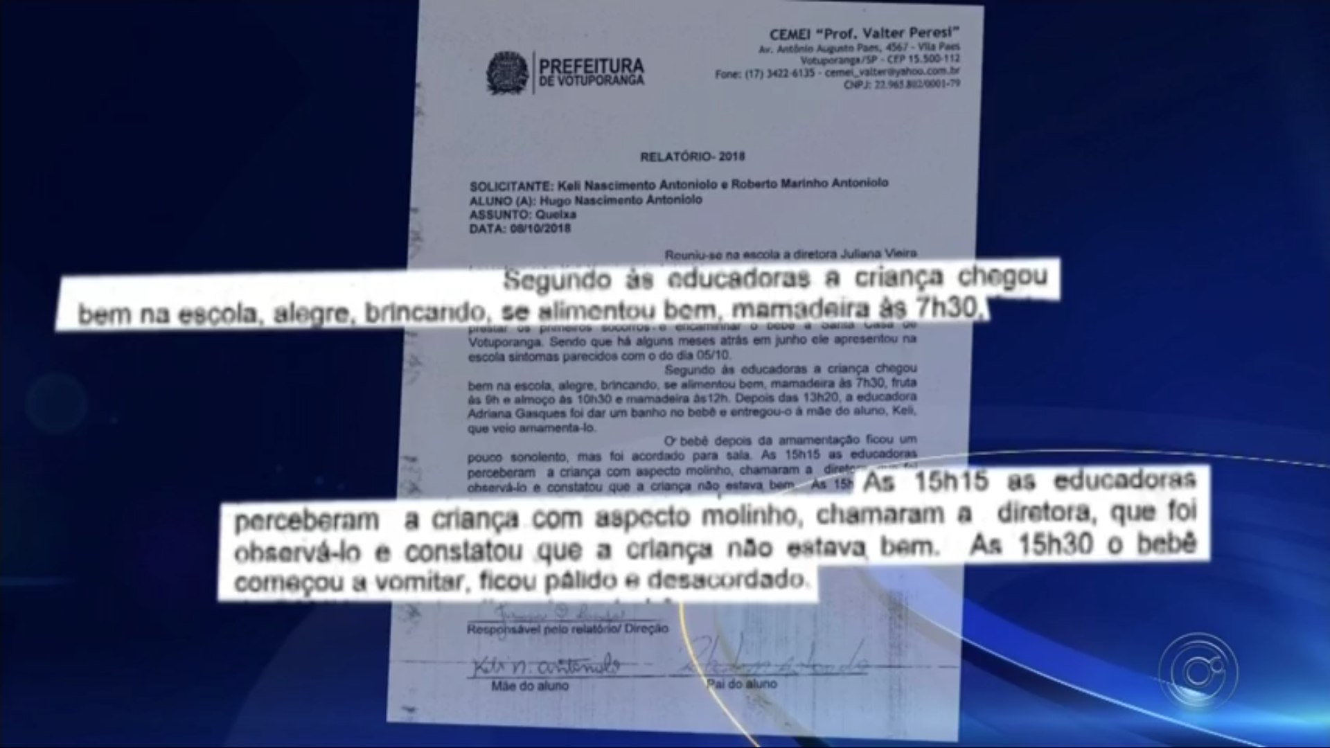 Na última vez que a criança foi levada à Santa Casa, ficou três dias internada. Com isso, Kelli procurou a Secretaria de Educação para fazer um relatório de queixa, em que foram expostos, pela diretora da escola, que o bebê chegou “bem na escola, alegre, brincando e se alimentou bem no início da manhã.”