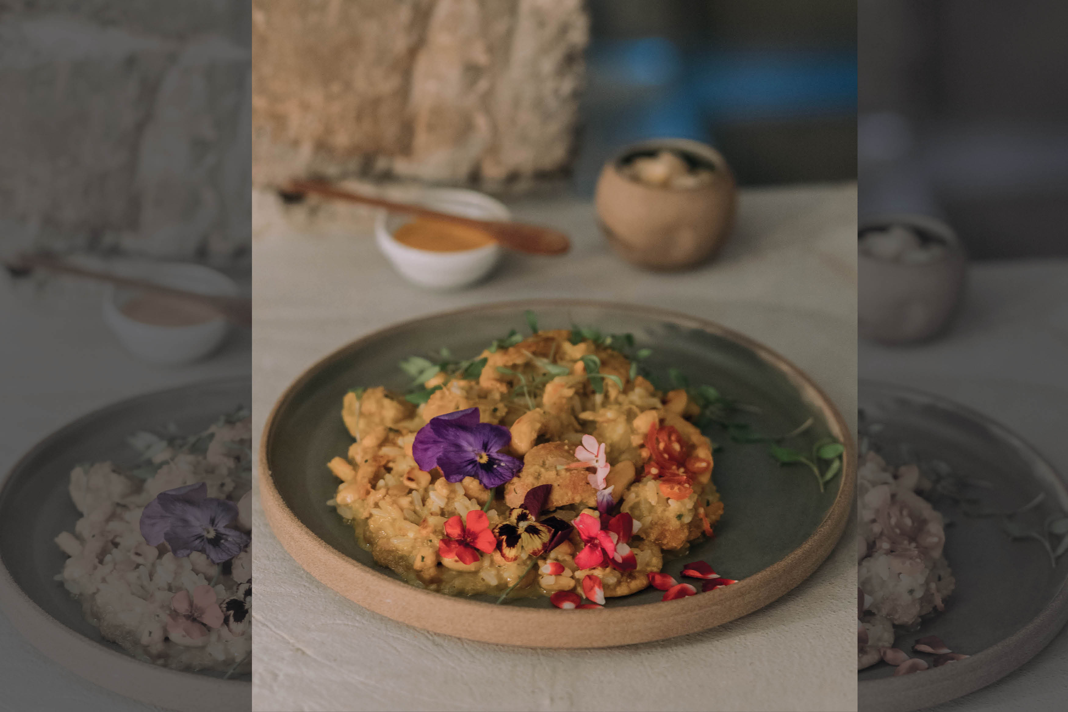 Incorpore o arroz ao frango e cozinhe em fogo baixo por 10 minutos, deixe descansar por 10 minutos e ajuste o sal. Para finalizar, utilize brotos e flores comestíveis de sua escolha.