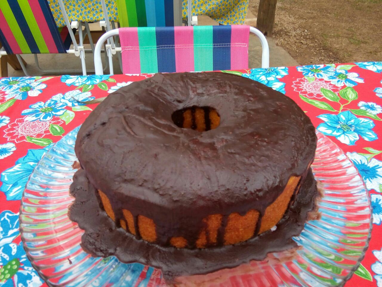 - Desenforme o bolo ainda morno e despeje a cobertura por cima dele