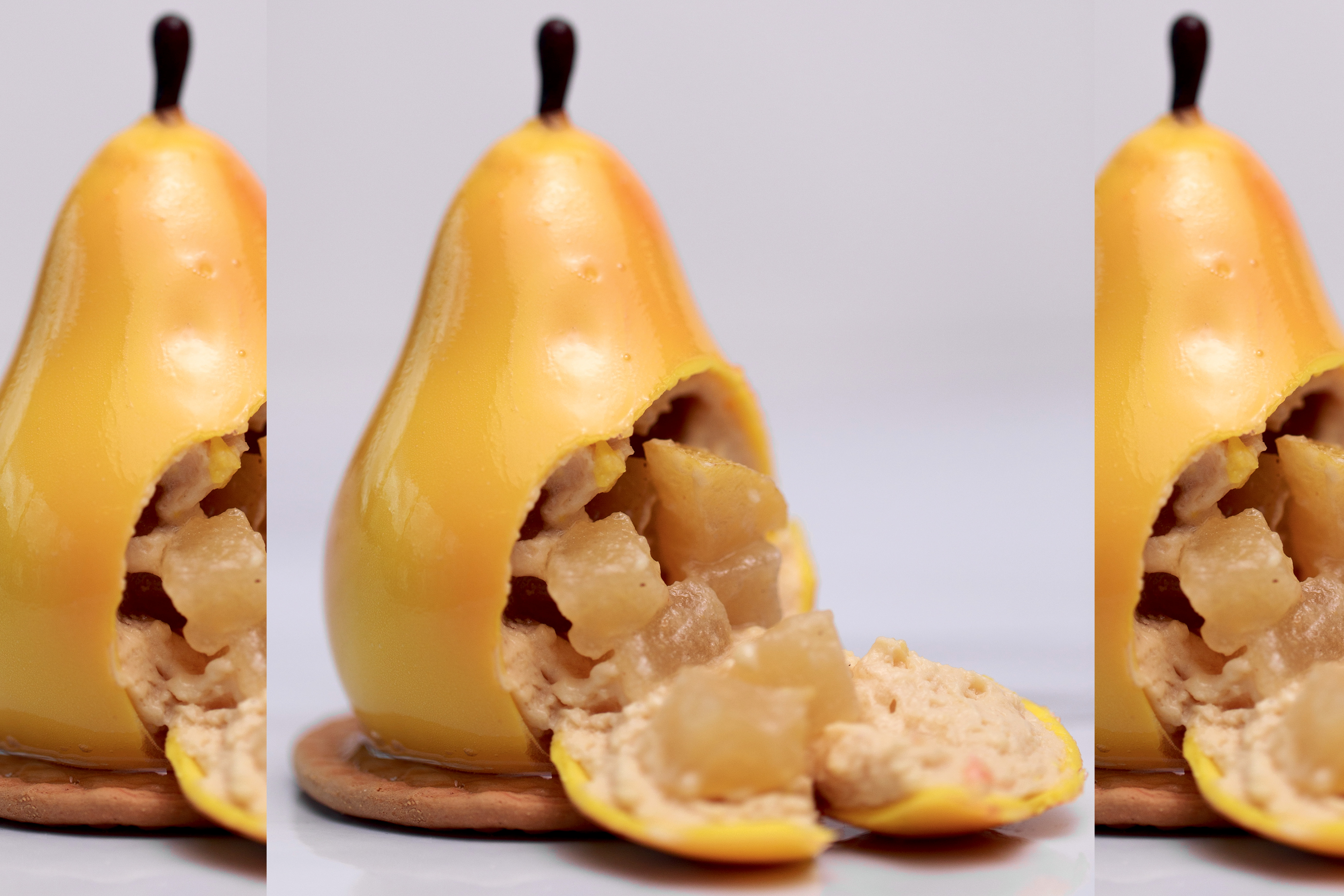 Finalização Em uma forma de silicone em formato de pera, coloque mousse de caramelo até um pouco mais acima da forma. Coloque o recheio de pera congelado no meio da forma com mousse. Preencha o restante da forma completamente com a mousse. Leve para congelar por 12 horas. Derreta o líquido da casquinha e deixe a 35ºC e banhe as peras congeladas. Aguarde secar. Derreta a glaçagem a 55ºC e banhe novamente a pera. Deixe secar. Num aerógrafo, coloque o corante e pinte levemente as peras finalizadas. Coloque o chocolate em um processador e bata até virar uma pasta (cuidado para não derreter). Modele os cabos e finalize a sobremesa.