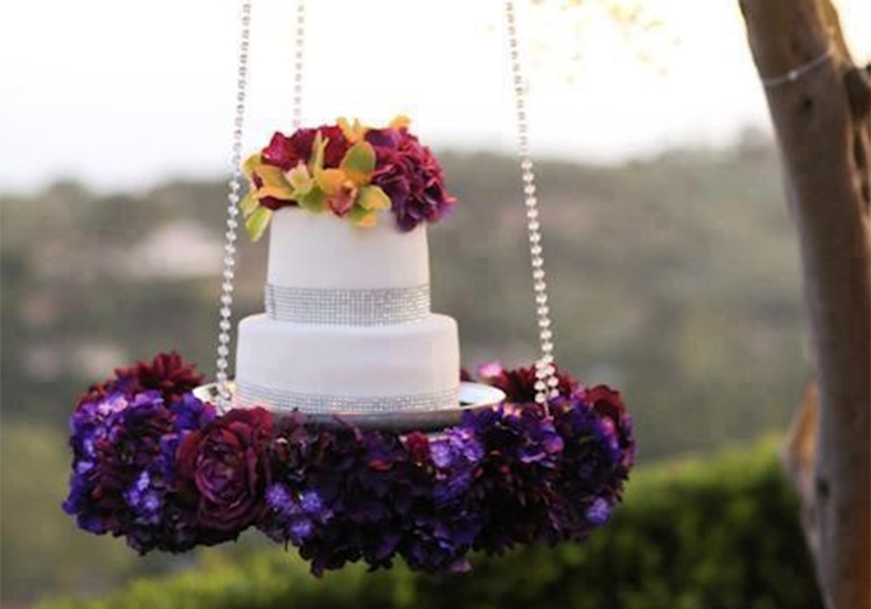 Pendurado em balanço e decorado com flores, o bolo suspenso vem conquistando as noivas pelo visual inusitado